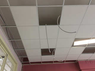 Ze zijn begonnen aan ons nieuwe plafond! En we kunnen eindelijk onze nieuwe kleur bewonderen. Appelgroen! De deuren van de kastjes zijn namelijk geleverd.